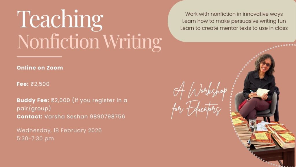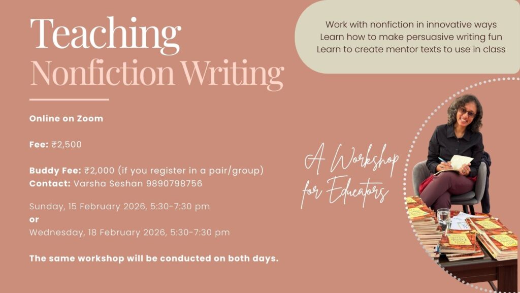 I also run online book clubs and creative writing programmes for children and teenagers. As a rule, new editions of my book club for ages seven and eight, and Read, Write, Explore for ages nine and ten begin every alternate month. My writing programmes are three months long and are conducted twice a year – April to June, and October to December.