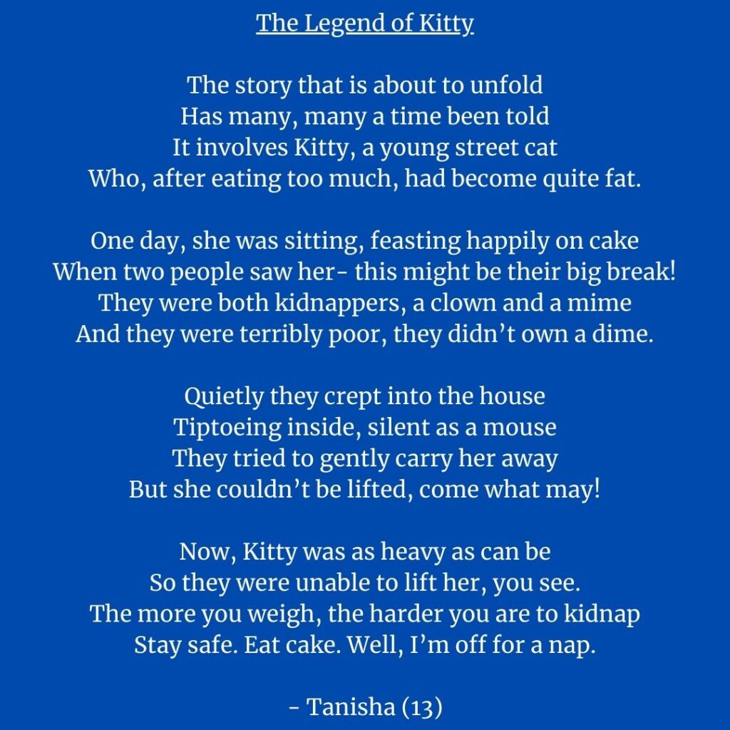 The stories, the poetry, the fun – nothing changes in the online model. It’s just as exciting as my writers’ club. In fact, I would say it’s more exciting because I have children from all over the country, and one child from another country too! Over and over again, I come across wonderful pieces of writing. Look at these, for instance!