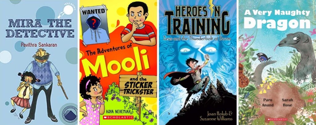 At the back of A Very Naughty Dragon, we have these three words. The Adventures of Mooli and the Sticker Trickster has the words ‘friendship’, ‘adventure’ and ‘mystery’. As this is the last book we will be reading at the December edition of my reading programme, we’ll look at the other books – Mira the Detective and Zeus and the Thunderbolt of Doom – and brainstorm a list of words that we think suit the story.