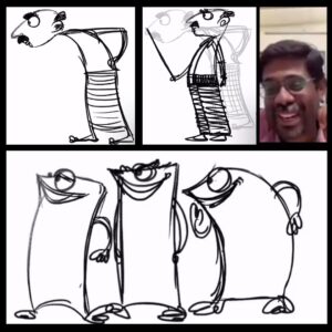 Practice. What a difference practice makes! Right through yesterday's guest session on character design, I marvelled at how swiftly Priyankar Gupta created his characters. Talking all the time, explaining what he was doing, he was able to draw not one, but six full forms in fifteen minutes!Characters, both human and non-human, are led by three parts of the body – the chest, the nose and the pelvis.An inquisitive person tends to hunch. The whole body structure is led by the nose. A confident person is led by the chest. This is why people in the army, or even dancers, tend to have accentuated chests. All of us also have an aspect of us that is lazy, one that likes to sit and watch the world go by. This sort of character is led by the pelvis.Once Priyankar had shared a few sample drawings, he asked us to draw characters of our own. Soon, the children shared sketches … [Read more...]