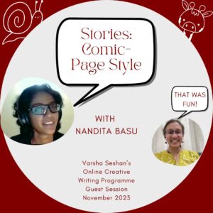 What a rewarding session we had with Nandita Basu! At workshops like this one, I think I learn as much as the young writers who sign up.Step by step, Nandita led us through the creation of one page of narrative that brings together text and illustration in the style of a graphic novel. We launched straight into the workshop with an interesting prompt that made all of us think. We've all wronged someone at some point in our lives; there's been a time when we were needlessly nasty to someone who didn't deserve it. This formed the basis of the plot we went on to sketch over the next hour.Layouts, structure, characters, setting, conflict, emotion ... in a single hour, Nandita led us through the whole lot. How important is background when setting the context of our story? Is it all right to make stick figures rather than fully detailed characters? How large or small should the … [Read more...]