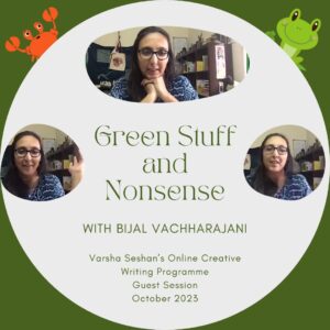 What a fun session we had on green writing with Bijal Vachharajani! In a single hour, we spoke of a million creatures from elephants to frogs, ferrets to spiders, lion-tailed macaques to slugs that aren't slugs.Bijal's workshop was a guest session at my writing programme. We've just reached the end of our poetry module, so it was the perfect time to invite a guest to do a workshop for us, and I thought of Bijal because the Art is Everywhere series - which Bijal has co-authored - is one of my favourite sets of rhyming verse. I loved how she led us through the workshop yesterday, beginning with a free writing exercise for us to shed our inhibitions and get writing and then moving on to more structured writing.In the central element of the workshop, Bijal showed us seven images (all taken by one of her co-authors Radha Rangarajan), and asked us to write two lines of poetry about … [Read more...]