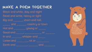 I spend hours scouring the internet for creative writing resources. I love those hours, even though sometimes I find myself panicking. There are so many wonderful ideas out there! What can I use? I want to use them all! At those times, I need to step away from my laptop and remind myself that I cannot do everything in twelve weeks. The weeks always fly by once I start a writing programme. I'm more than halfway through. Here are a handful of activities I used successfully this time! Rhyming Opposites This seems like an overly simplistic activity, but it works with people (I won't even say just children) of all ages. It is based on something I came across in the book Writing with Children, by Jackie Reilly and Vanessa Reilly and serves as a great way to begin a session on rhyme! How would you fill in the blanks? Musical Writing I have no idea … [Read more...]