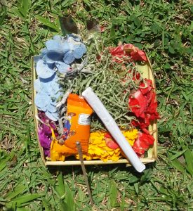 Today, I finally finished writing my travelogue, which is over 50 pages long. I needed to get that done quickly before I forgot all the details! And now, I can leisurely write my blog, bit by bit, with one exciting detail after another.We were a group of ten dancers, and we were put up at Alam Puri, a resort that lives up to its name. 'Alam' means 'nature' or 'natural', and 'puri' is a castle. Alam Puri was really like a castle in the midst of nature!Yet, I would say that that's true of almost everything we saw in Bali - royalty and nature. The smallest little door in the middle of nowhere is ornately carved. And all around it is greenery that takes your breath away.I'll begin my series of travel articles with an offering, and the story behind it. Do you see the cigarette in the picture? We heard two stories about why the cigarette is there.Story 1 - When you make … [Read more...]