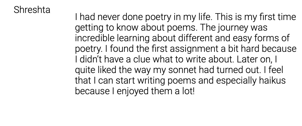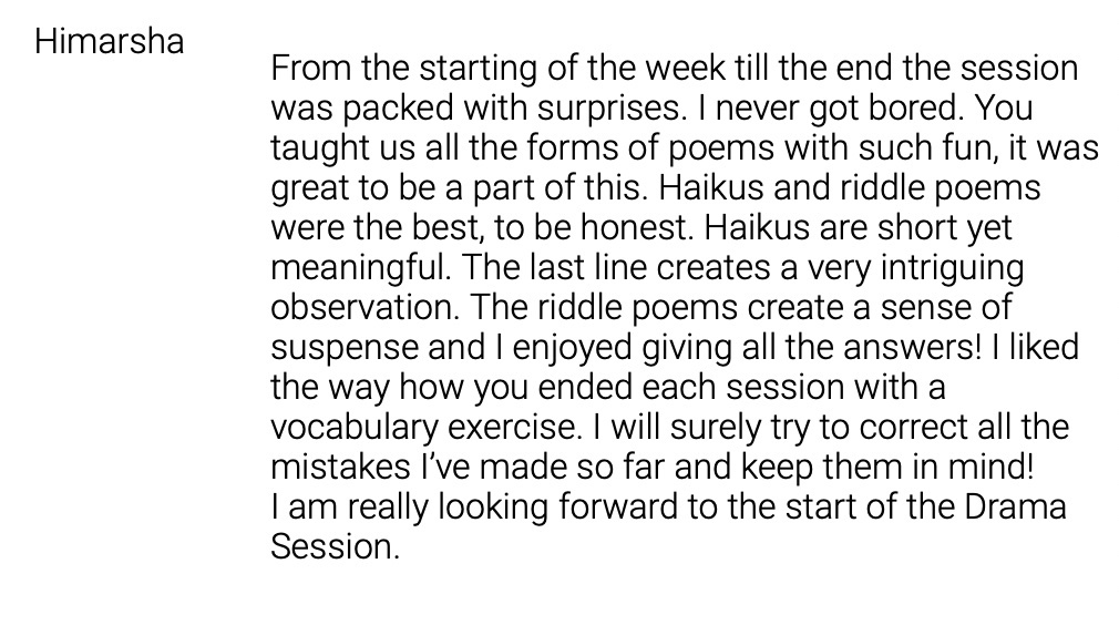 Poetry is always fun, and we did so much in four weeks. Haikus, sonnets, cinquains, riddle poems, list poetry, concrete poetry … Here’s what a couple of children have to say about it!