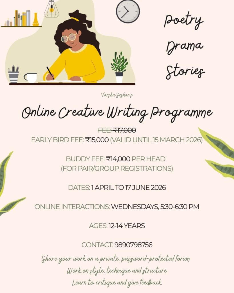 The regular fee for a 12-week writing programme (ages 9+) is ₹17,000 per participant. The early bird fee (valid until 15 March) is ₹15,000. If you sign up in a pair/group, you can pay the buddy fee of ₹14,000 per head.