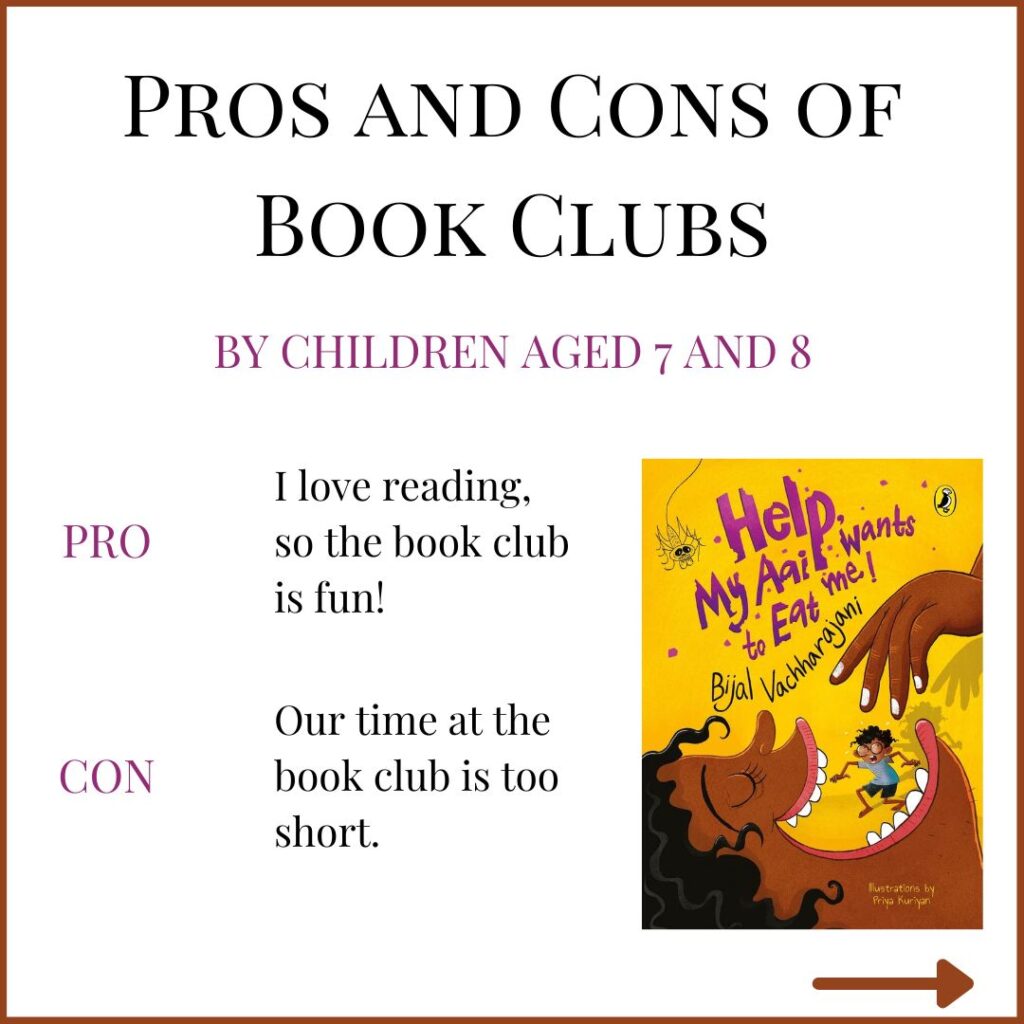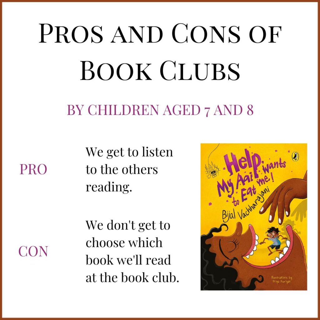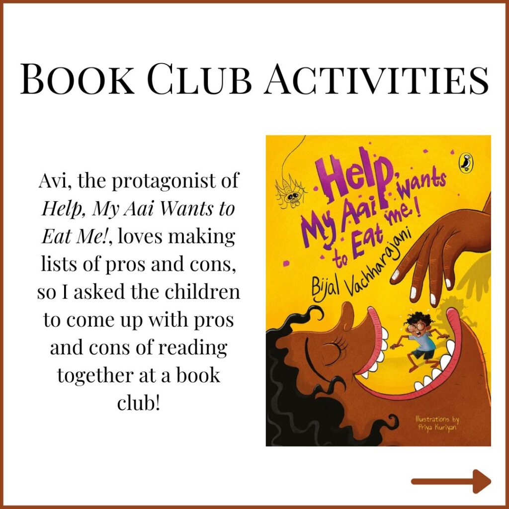 Some time ago, we read Help, My Aai Wants to Eat Me! at my book club. As planned, one of the things we did as we read the book was to make a list of pros and cons, like the protagonist Avi. Look at some of what we discussed.