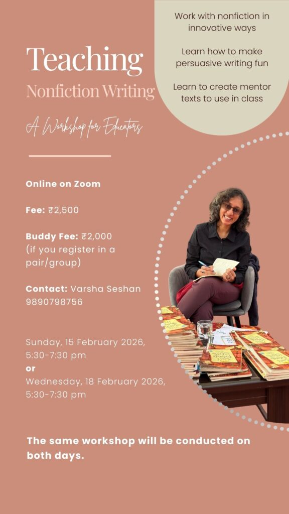 I’ve been conducting teacher training workshops since 2015! In August 2025, for the first time, I conducted an independent online workshop on teaching creative writing. I was overwhelmed by the response! There’s been no looking back, and I hope to conduct one every couple of months.