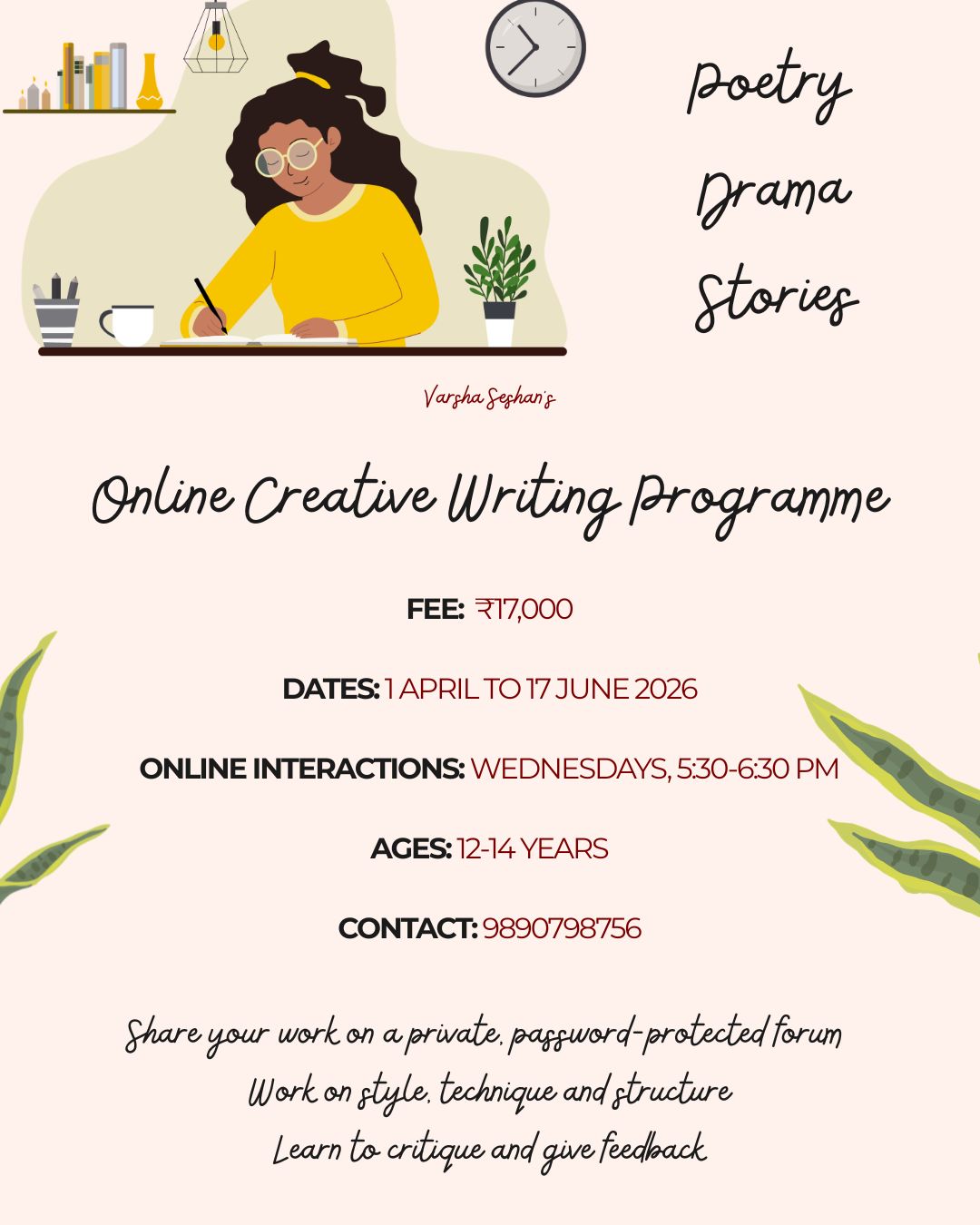 Twice a year, I offer a 12-week online creative writing programme, during which we work on different kinds of writing, from speeches and memes to stories and plays. This is an intensive programme that I offer to ages 12-14.