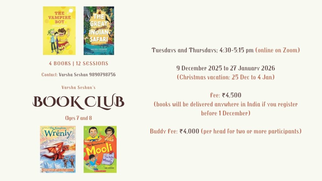 I’ve read barely any nonfiction with my book club. Historical fiction, yes, but nonfiction? I can remember having read only Sita’s Chitwan. The theme of The Great Indian Safari by Arefa Tehsin is similar–wildlife. It’s a theme close to my heart, and I find myself using every opportunity I can to introduce books about it to children.